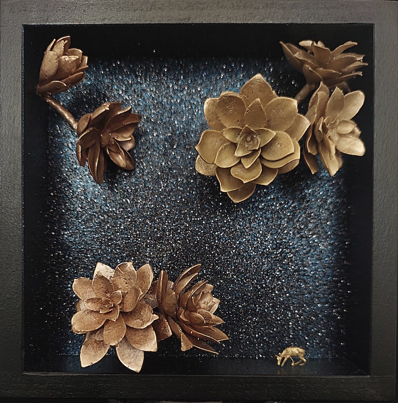 "avoir un coeur vivant" / feuilles de gingko, cuivre, personnage en laiton, feuille d’or / 20 cm x 20 cm x 3 cm