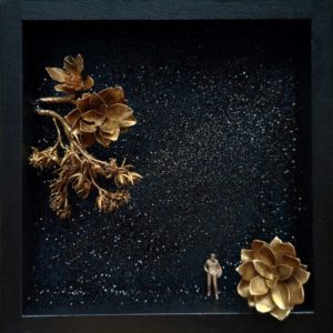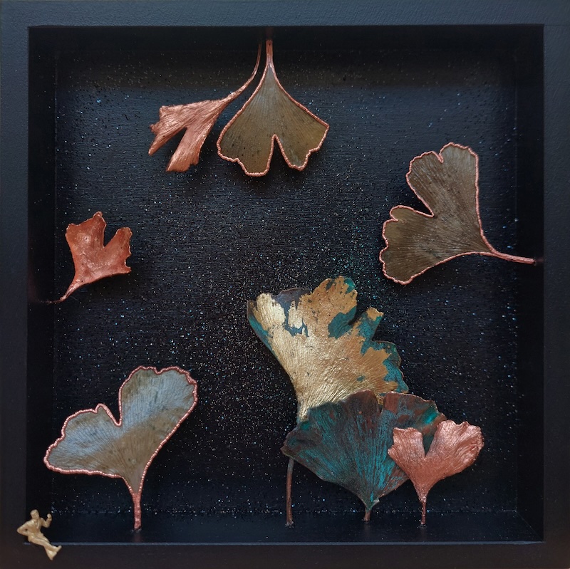 feuilles de gingko, cuivre, personnage en laiton, feuille d’or